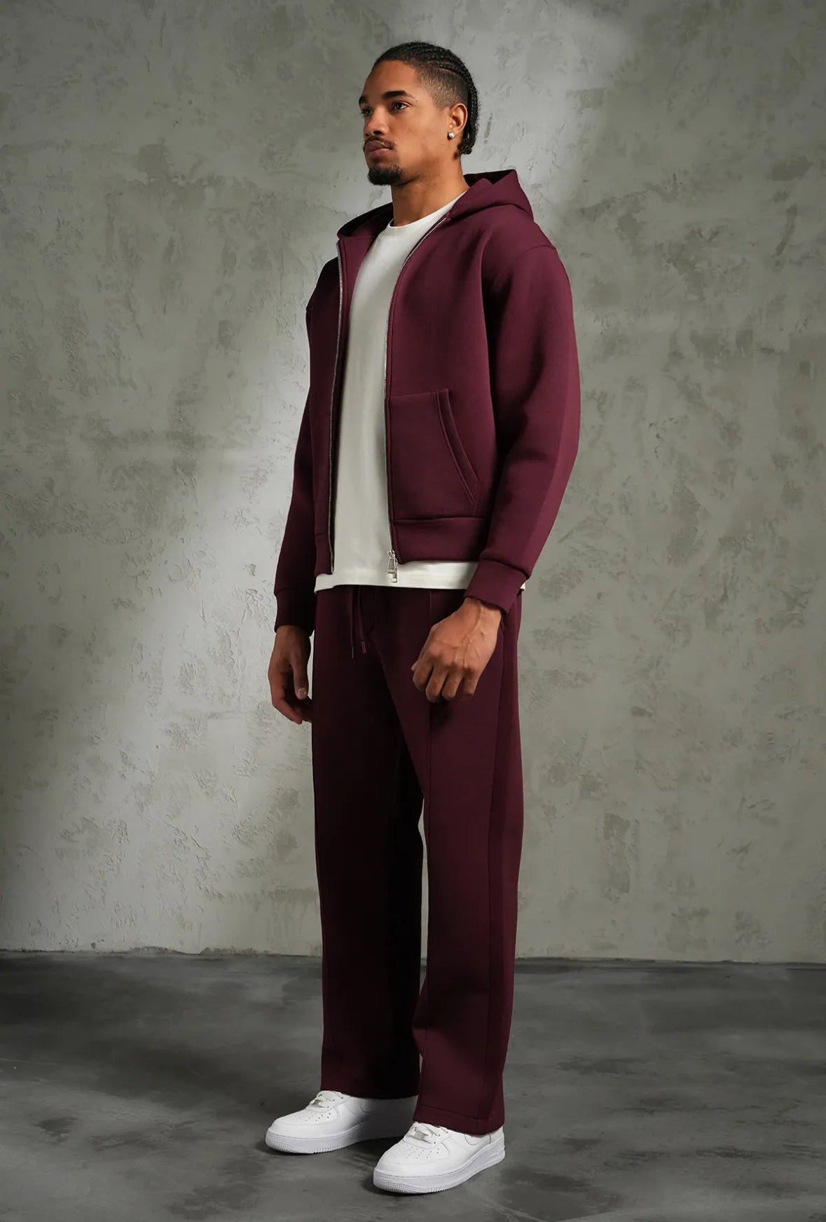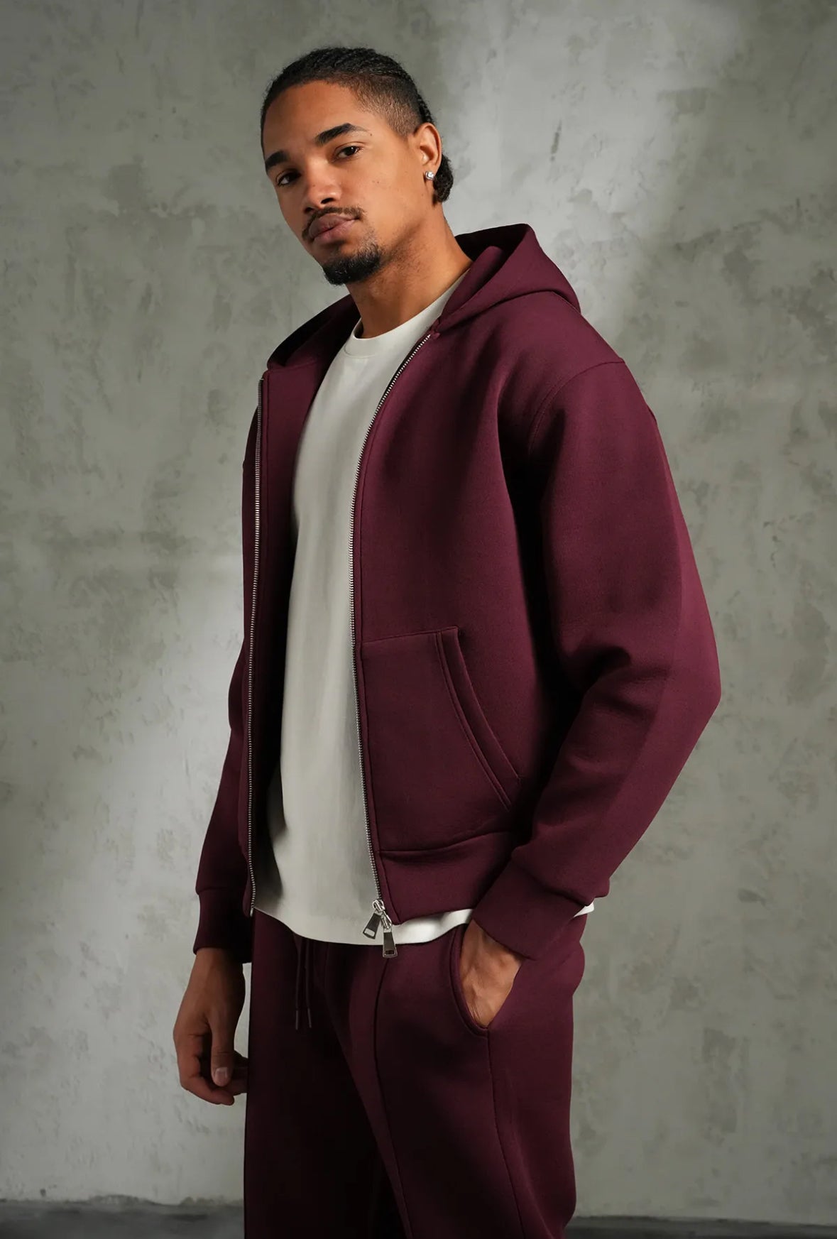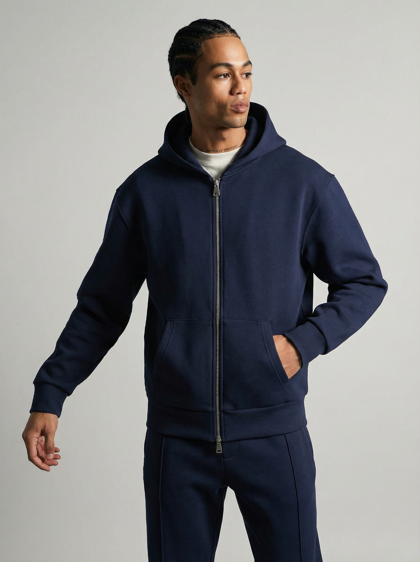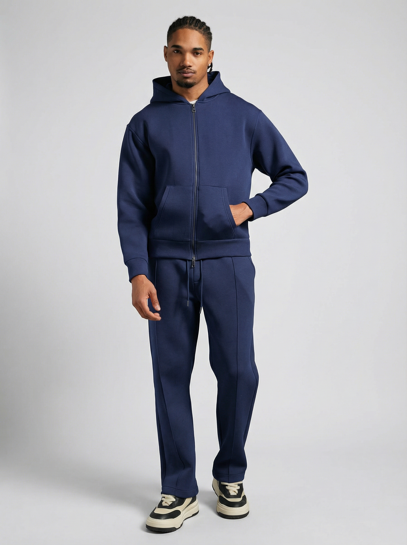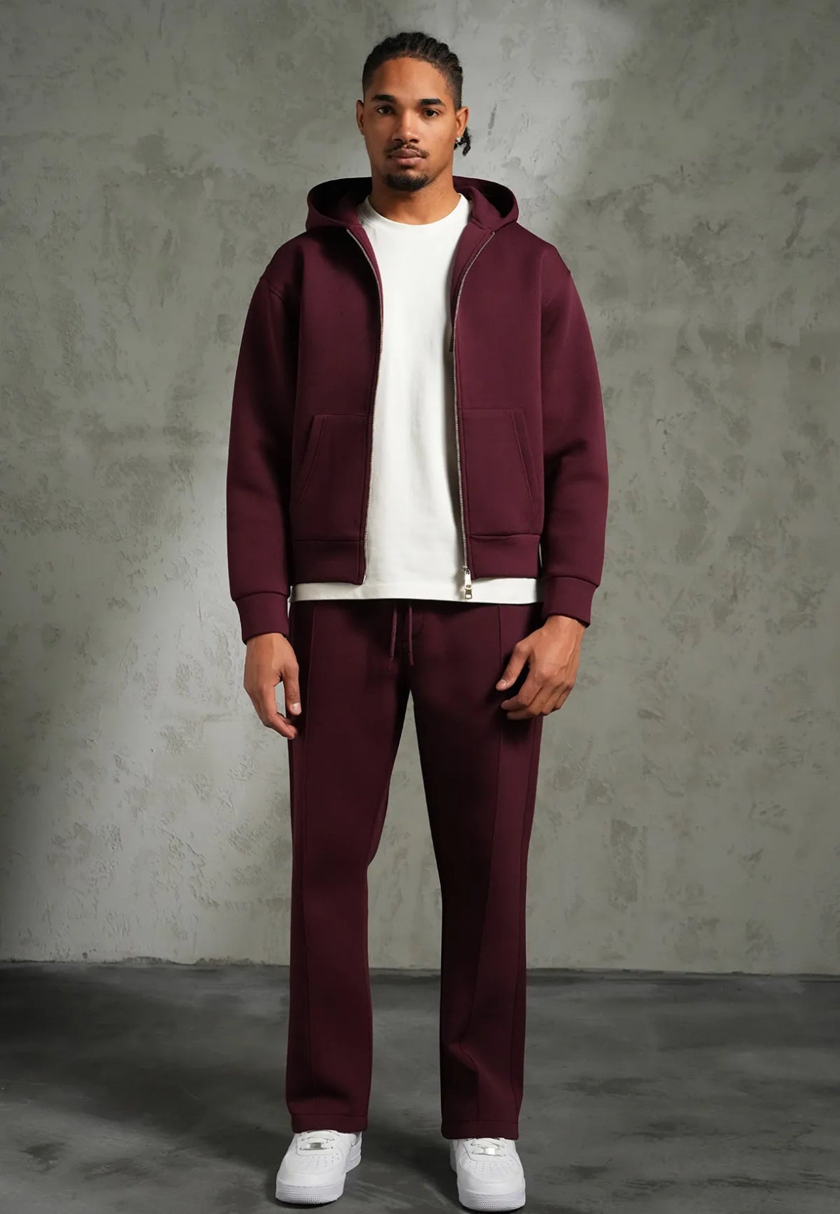 Adoptez un look urbain épuré avec cet ensemble veste à capuche zippée et pantalon assorti, pensé pour allier confort, style et praticité.