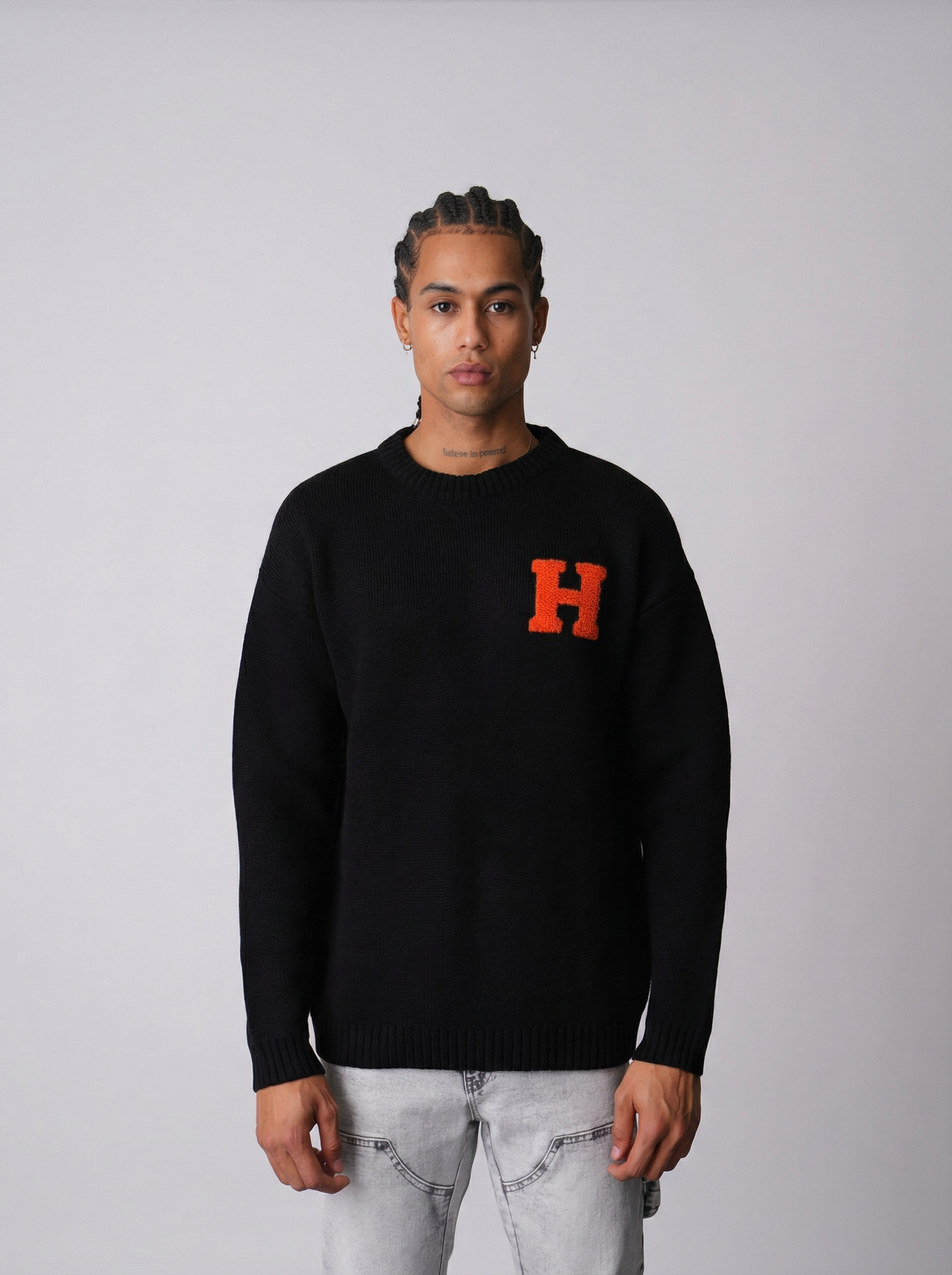 Affirme ton style avec ce pull noir intemporel à l’allure universitaire. Orné d’un "H" brodé en rouge sur le torse, il s’inspire des classiques du style varsity américain, tout en gardant une coupe moderne et confortable.