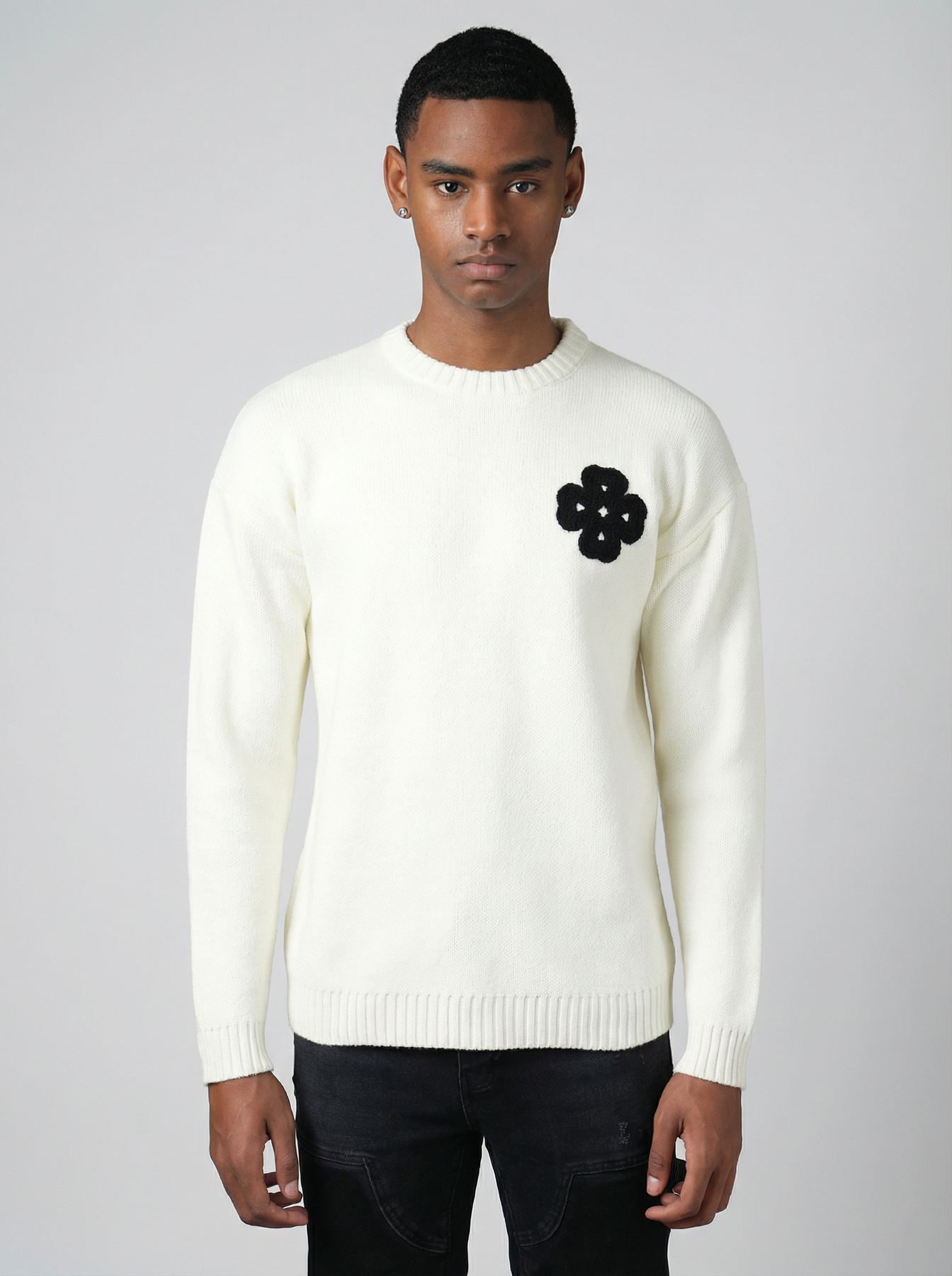 Affirmez votre style avec ce pull en maille épaisse orné d’un motif brodé en forme de trèfle graphique. Confortable, moderne et distinctif, le Pull Trèfle se distingue par sa broderie texturée positionnée sur le torse. Son design minimaliste à l'arrière contrebalance l’audace du visuel frontal pour un rendu élégant et équilibré.