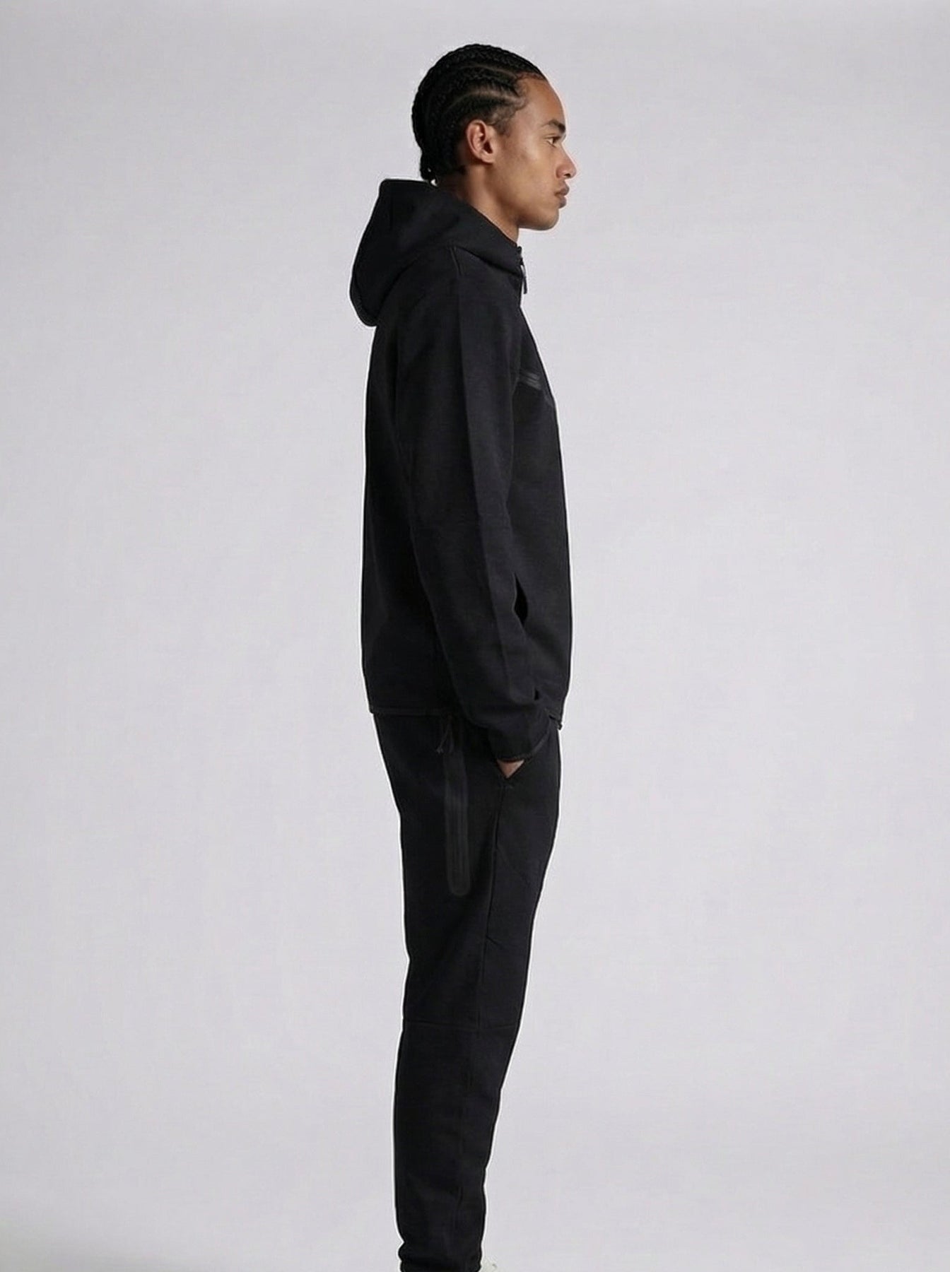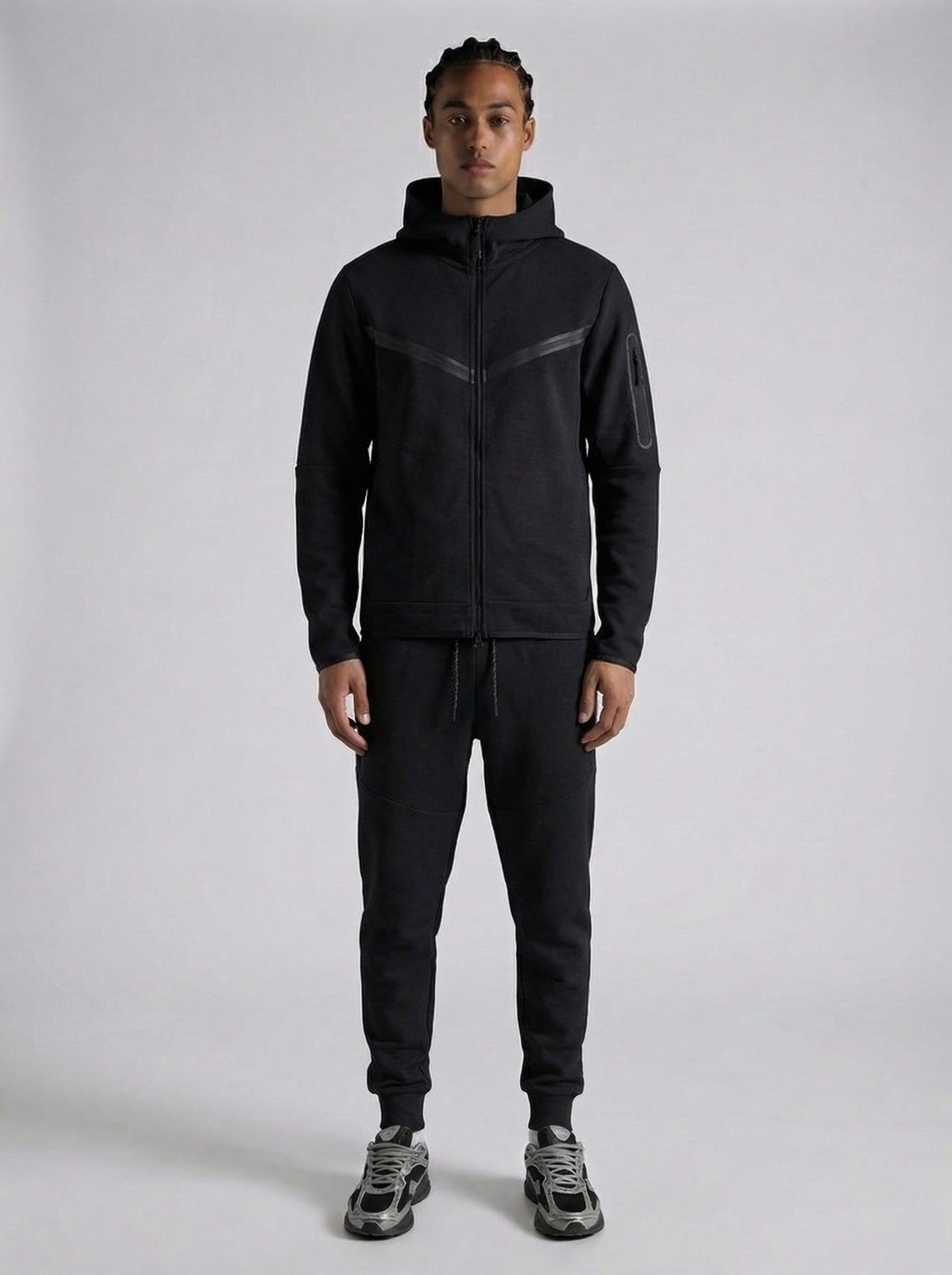 Ensemble survêtement homme style techwear composé d’un hoodie zippé à capuche et d’un pantalon jogging assorti. Sa coupe moderne et ajustée offre un look streetwear tendance tout en garantissant un excellent confort au quotidien.