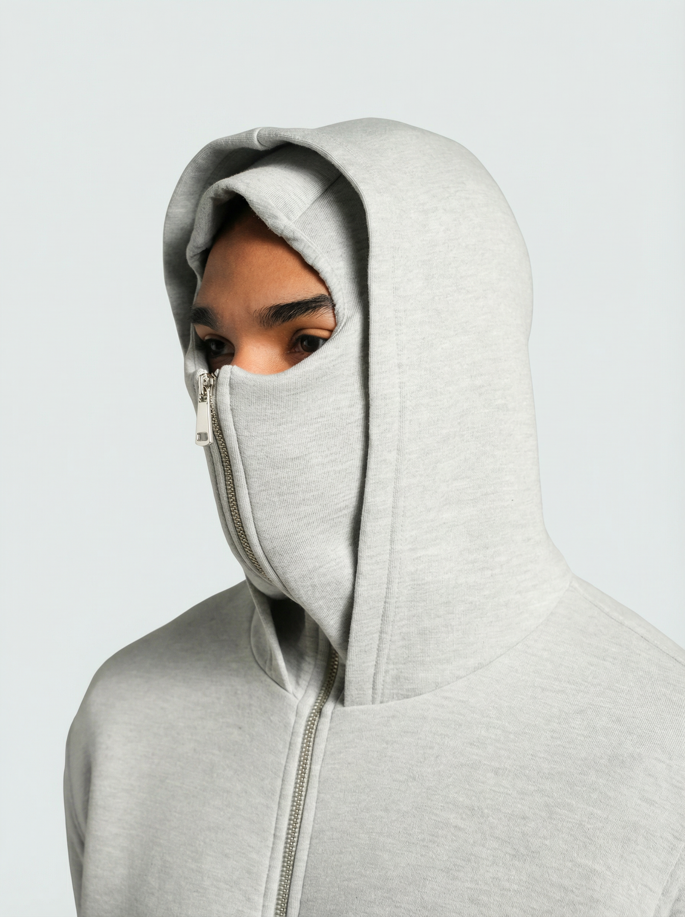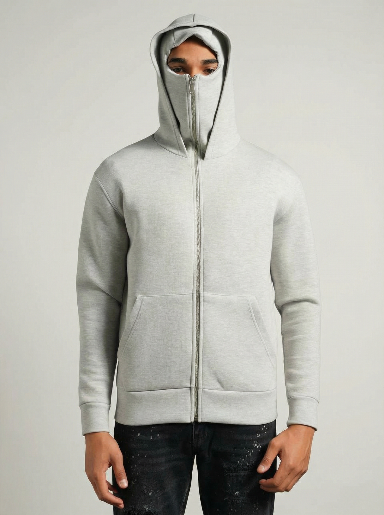 Affirme ton style tout en gardant un look audacieux avec ce hoodie unique en son genre. Conçu pour les esprits libres et les amateurs de streetwear minimaliste, ce hoodie zippé gris clair se démarque par sa capuche masque intégrée, qui peut se fermer jusqu’au sommet pour couvrir le bas du visage. Que tu cherches à te protéger du vent ou simplement à faire tourner les têtes, ce modèle t'offre confort et originalité.