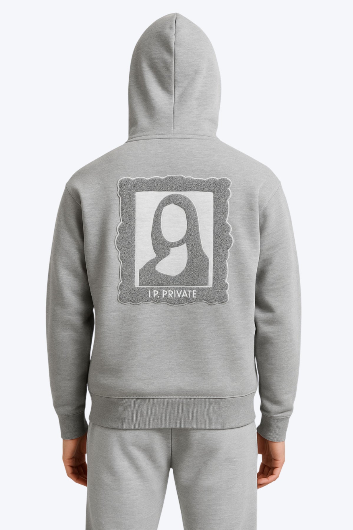 À l’avant, une broderie détaillée de l’Arc de Triomphe rappelle la fierté parisienne. À l’arrière, un patch brodé effet bouclette façon Mona Lisa stylisée, signature de la collection "I.P. PRIVATE", vient ajouter un contraste artistique percutant. Le hoodie est confectionné dans un coton épais et doux, parfait pour la mi-saison comme pour l’hiver.
