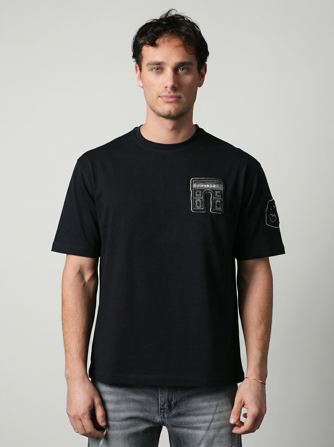 Affirmez votre style avec ce t-shirt homme au design streetwear moderne, doté d’un patch graphique texturé au dos et d’un détail brodé sur la poitrine. Son contraste visuel et ses finitions travaillées apportent une vraie identité à votre tenue.
